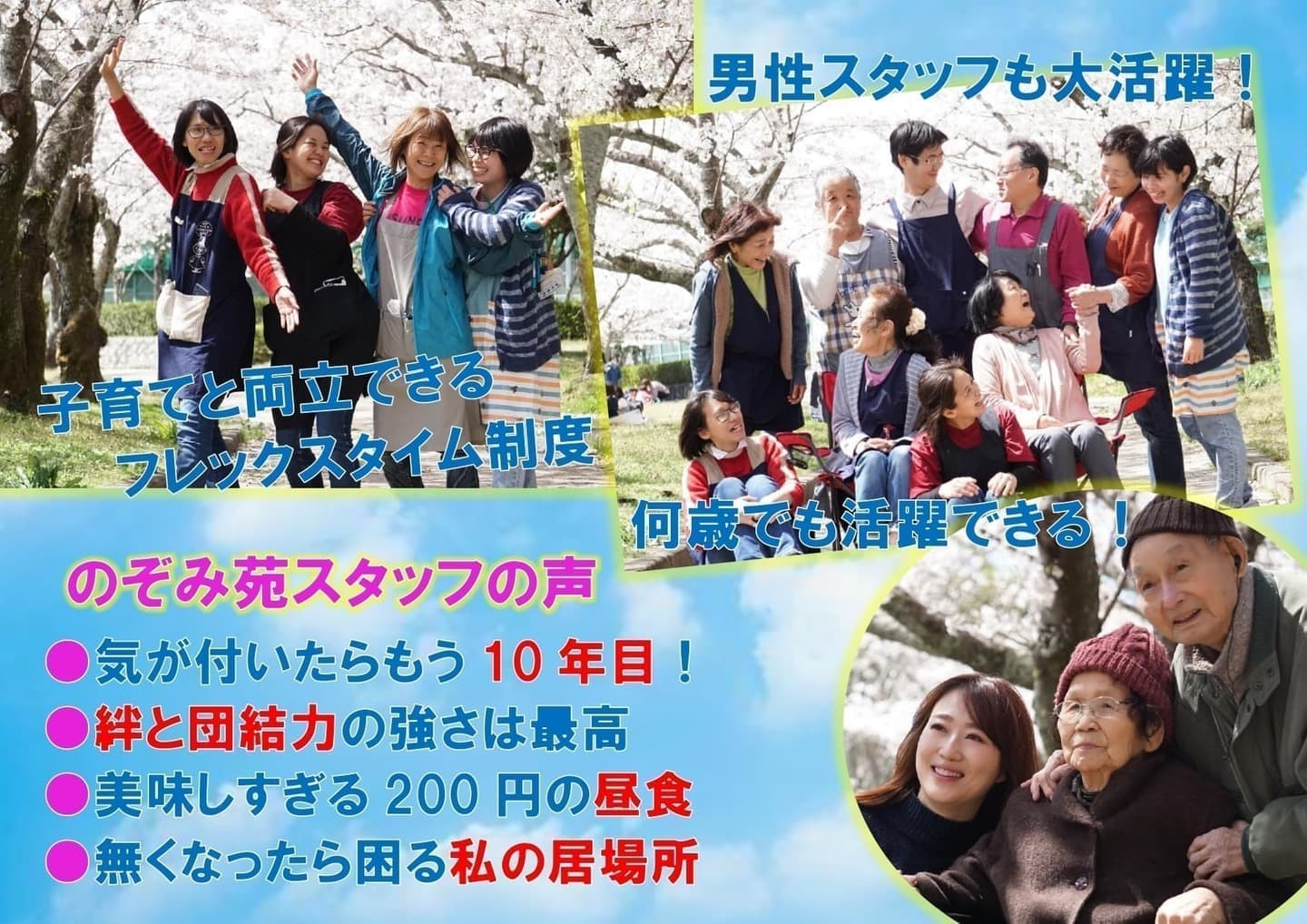 ・ユニット(9名)のフロアリーダーを目指しケア業務全般 ・病院への付き添い ・ケア力向上に向けて研修参加 ※週2~4回、日勤のみでOK |